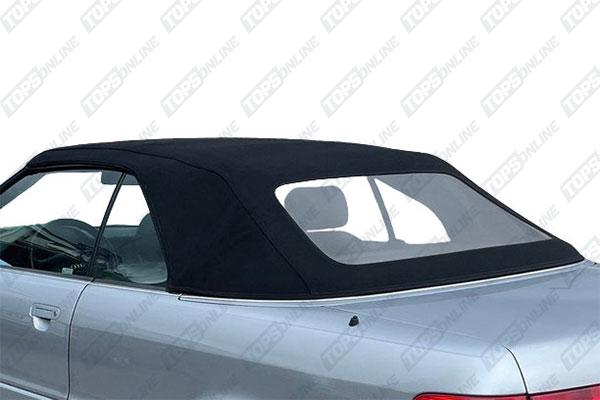 It’s a factory‑style, one‑piece soft top that fits the 1992-2000 Audi Cabriolet & Cabrio 80, both manual and power-top frames. It features a heat-sealed, 40‑gauge clear (or optional green-tint) plastic window and includes factory-style rain‑guards above the door glass, matching the original design.