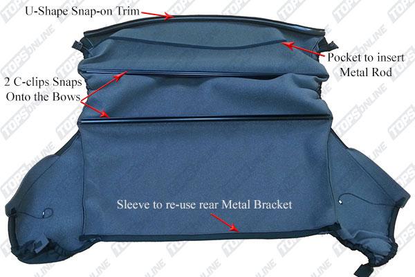 Style-3 Headliner has 2 C clips that snap onto Top frame bars, Snap on Trim (pinch welt) across the front & rear pocket to slide in existing metal Bar. Car has Manual Top Lock. This is the rare style for the Late 97 to 99 models. If you have a 1997 model with Manual Top Lock, check Style-1, Style-2 & Style-3 Headliner pictures & order accordingly.
