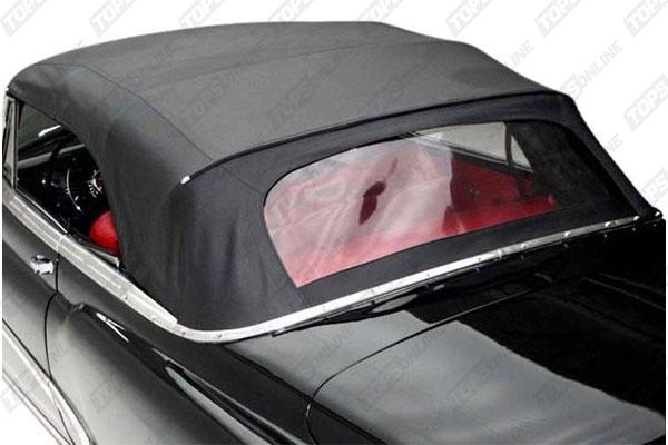 Factory style 2-Piece Top with Horse-Shoe style Zipper Plastic Window. Included with the Top, Wire-On trim & Chrome ends to hide the Staples above rear window bow & above windshield bow. We offer Haartz Stayfast Cloth material. Other colors can be ordered, please inquire.