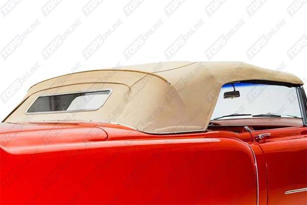 Factory Style Top with Non-Original Double Thick layer Horse-Shoe style Zipper Rear Window Blank Curtain. New Glass Window not included with the Top, you can RE-Use your own Glass or buy it separately. Included with the Top, Wire-On trim & Chrome ends to hide the Staples above rear window bow. We offer Haartz Pinpoint Vinyl & Haartz Stayfast and Twillfast Cloth materials. Other colors can be ordered, please inquire.