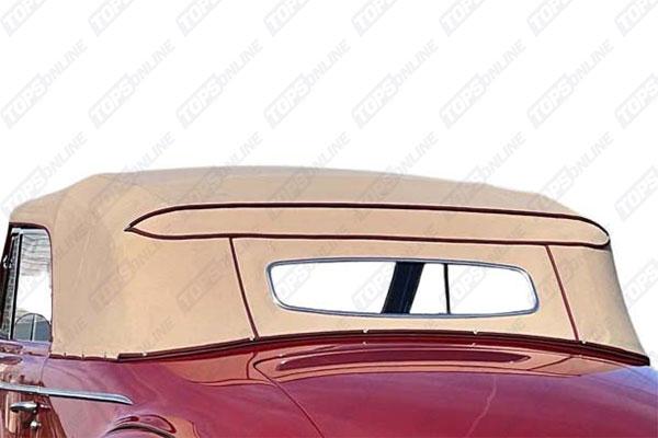 Factory Style Top with Double Thick layer Horse-Shoe style Zipper Rear Window Blank Curtain. New Glass Window not included with the Top, you can RE-Use your own Glass or buy it separately. Included with the Top, Wire-On trim & Chrome ends to hide the Staples above rear window bow, below rear window bow & above windshield bow. We offer Original Haartz Stayfast Cloth material. Other colors can be ordered, please inquire. These Tops are made with matching color binding (edging) & stitching. Custom-made tops with different color binding & stitching can be made, please inquire.