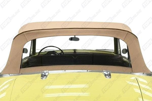 Factory Style 2-piece Convertible Top With Horse-Shoe style Zipper Plastic Window. Included with the convertible top: Wire-On trim & Chrome ends to hide the staples above the rear window bow. We offer Haartz Pinpoint Vinyl & Haartz Stayfast Cloth materials. These Tops are made with matching color binding (edging) & stitching. Custom-made tops are available as well: if you would like other colors and materials for the top, binding, and stitching, please inquire.