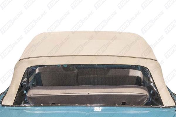 Factory Style 2-piece Convertible Top With Zipper Plastic Window. Top and Window have installation alignment marks. Included with the convertible top: Wire-On trim & Chrome ends to hide the staples above the rear window bow. Factory Original material is the Haartz Pinpoint Vinyl, we also offer Haartz Stayfast Cloth material. Other colors can be ordered, please inquire.