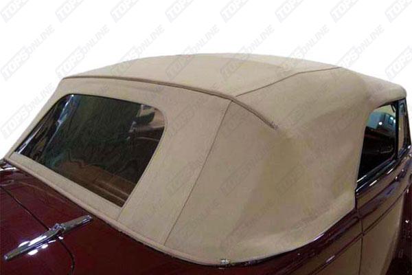 Factory style 2-Piece Top with Horse-Shoe style Zipper Plastic Window. Included with the Top, Wire-On trim & Chrome ends to hide the Staples above rear window bow, below rear window bow & above windshield bow. We offer Haartz Pinpoint Vinyl & Haartz Stayfast Cloth materials. Other colors can be ordered, please inquire. These Tops are made with matching color binding (edging) & stitching. Custom-made tops with different color binding & stitching can be made, please inquire.