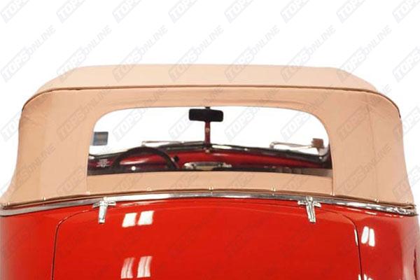 Factory style 2-Piece Top with Horse-Shoe style Zipper Plastic Window. Included with the Top, Wire-On trim & Chrome ends to hide the Staples above rear window bow & above windshield bow. We offer Haartz Pinpoint Vinyl & Haartz Stayfast Cloth materials. Other colors can be ordered, please inquire. These Tops are made with matching color binding (edging) & stitching. Custom-made tops with different color binding & stitching can be made, please inquire.