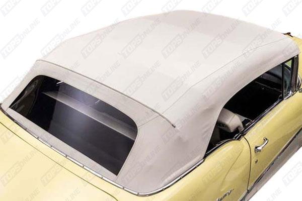 Factory style 2-Piece Top with Horse-Shoe style Zipper Plastic Window. Included with the Top, Wire-On trim & Chrome ends to hide the Staples above rear window bow. We offer Haartz Pinpoint Vinyl & Haartz Stayfast Cloth materials. Other colors can be ordered, please inquire.