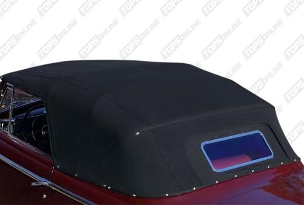 Factory Style Top with Double Thick layer Horse-Shoe Style Zipper Rear Window Blank Curtain. New Glass Window not included with the Top, you can Re-Use your own Glass or buy it separately. Included with the Top, Wire-On trim & Chrome ends to hide the Staples above & below rear window Bow, also, above windshield Bow. We offer Haartz Pinpoint Vinyl & Haartz Stayfast Cloth materials. These Tops are made with matching color binding (edging) & stitching. Custom-made tops are available as well: if you would like other colors and materials for the top, binding, and stitching, please inquire.