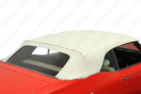 Factory style 2-Piece Top with Non-Original Plastic Window. The Convertible Top and Window have alignment marks to make installation easier. Included with the Top, Wire-On trim & Chrome ends to hide the Staples above rear window bow, also included, Matching Top material to use for front Header-seal (front Header-seal is not the front Rubber seal). Factory Original material is the Haartz Pinpoint Vinyl. Factory Original White color is the Haartz Pinpoint White Vinyl, we also offer Bright White option.