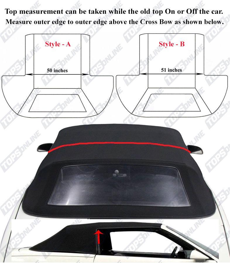 These cars came with 2 different size Tops from the factory, please click on Yellow Convertible Top Measurements Tab to see the measurements of each Top and order accordingly. The convertible top is made with factory material Haartz Stayfast Cloth. Other colors can be ordered, please inquire.